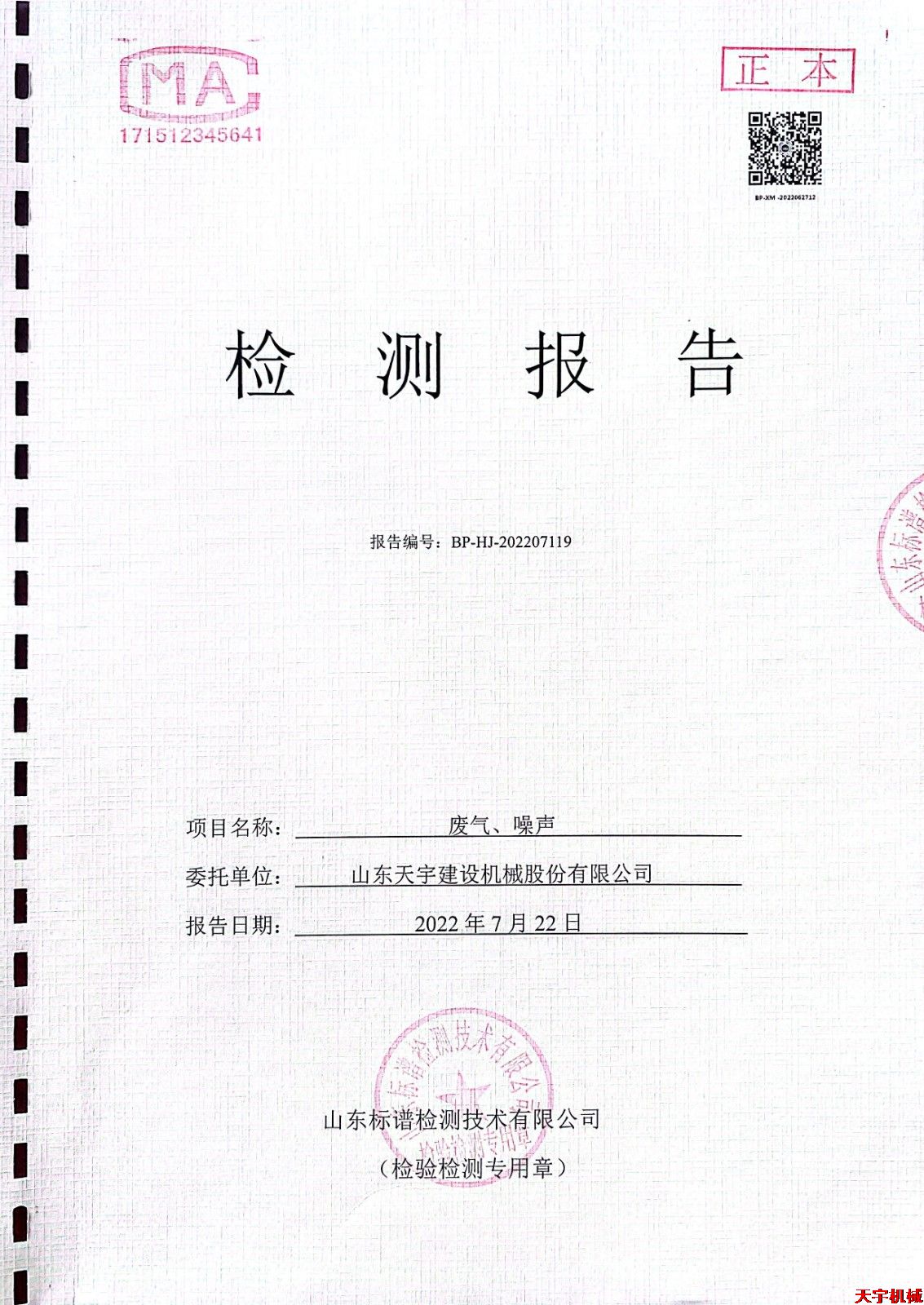 山東天宇建設機械股份有限公司廢氣、噪聲檢測報告公示